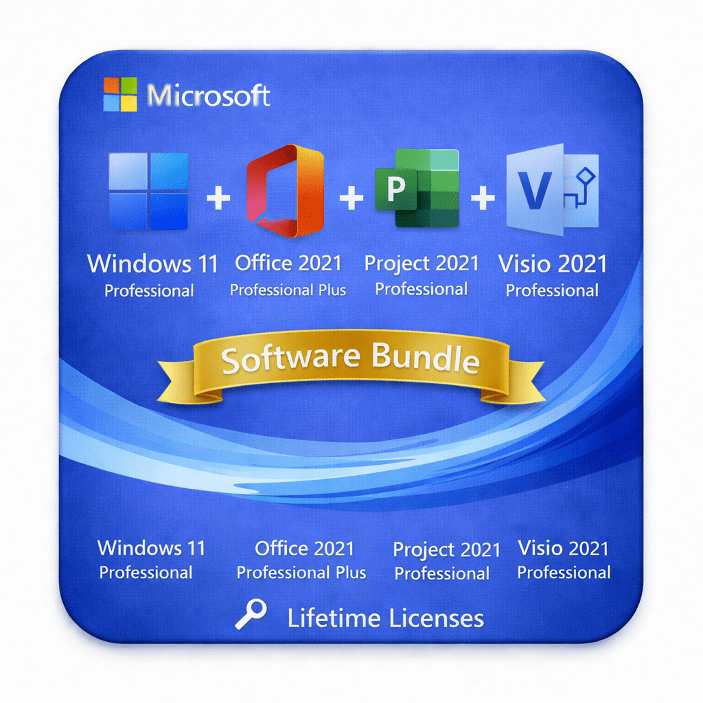 The Microsoft Windows 11 Professional, Office 2021 Professional Plus, Project 2021 Professional & Visio 2021 Professional Bundle delivers a complete operating system, productivity, project management, and diagramming solution in one powerful package. Designed for businesses and professionals, this bundle provides everything needed to run, manage, plan, and document projects efficiently.